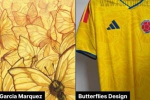哥伦比亚世界杯主场球衣的独特之处在于其蝴蝶图案,以此向哥伦比亚作家马尔克斯致敬,象征着希望、变革和爱的黄色蝴蝶在他的作品中频繁出现。