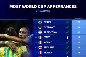 您的位置: 首页 > 资讯 > 足球资讯> 各国参加世界杯次数:巴西23次最多,德国21次、阿根廷19次前三!