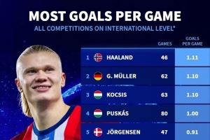 国家队场均进球榜:哈兰德1.11球居首,盖德-穆勒、柯奇士次席